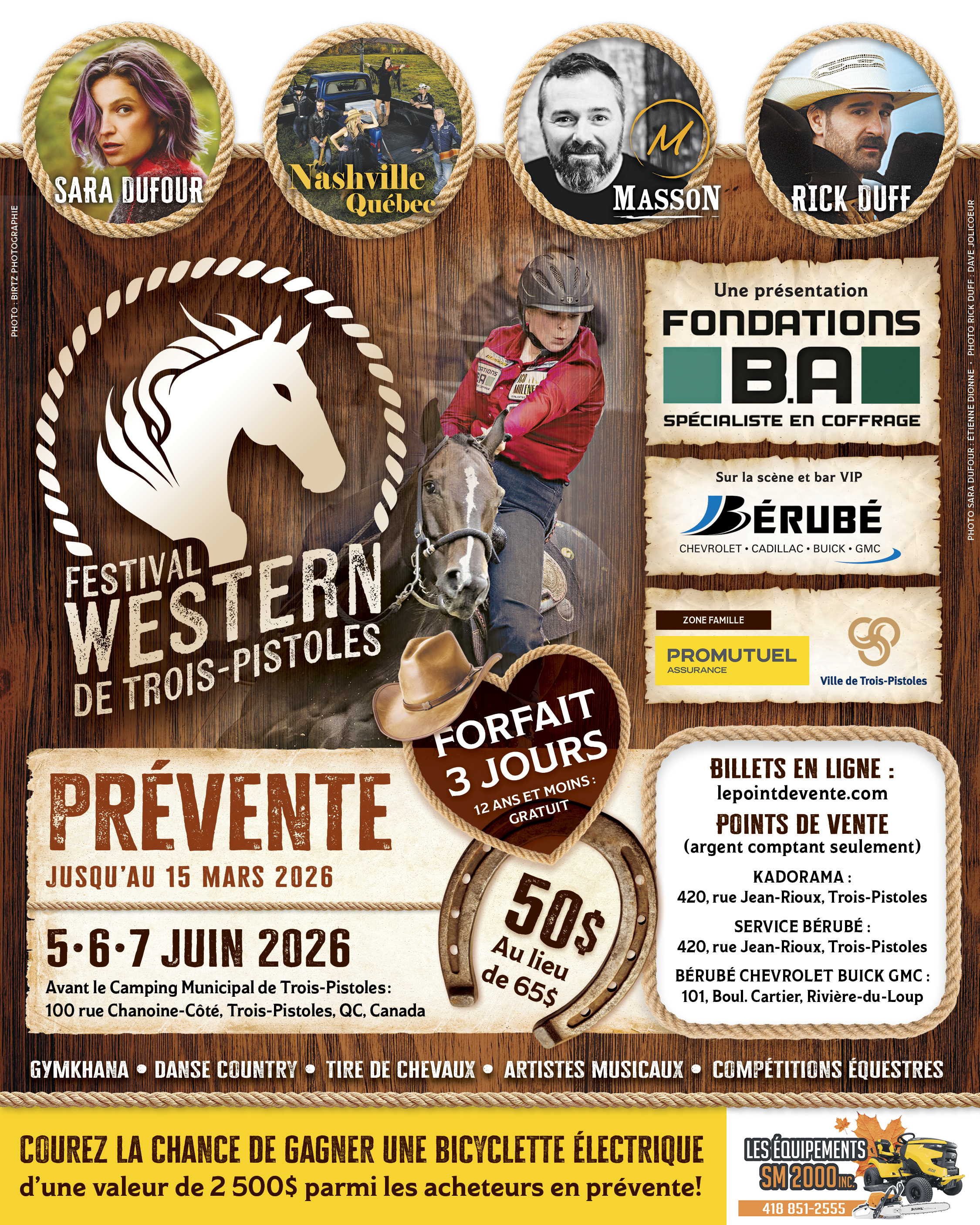 🎟️ PARTICIPEZ AU 50/50 OFFICIEL du tout nouveau Festival Western de Trois-Pistoles ! 💰🐎 Courez la chance de gagner gros, tout en soutenant la première édition de cet événement 100 % western 🤠 🎯 En ligne dès maintenant 📱 Des billets électroniques seront aussi en vente sur place durant le week-end ! 🗓️ Tirage : dimanche 8 juin à 16 h Merci de soutenir cette belle aventure qui ne fait que commencer !